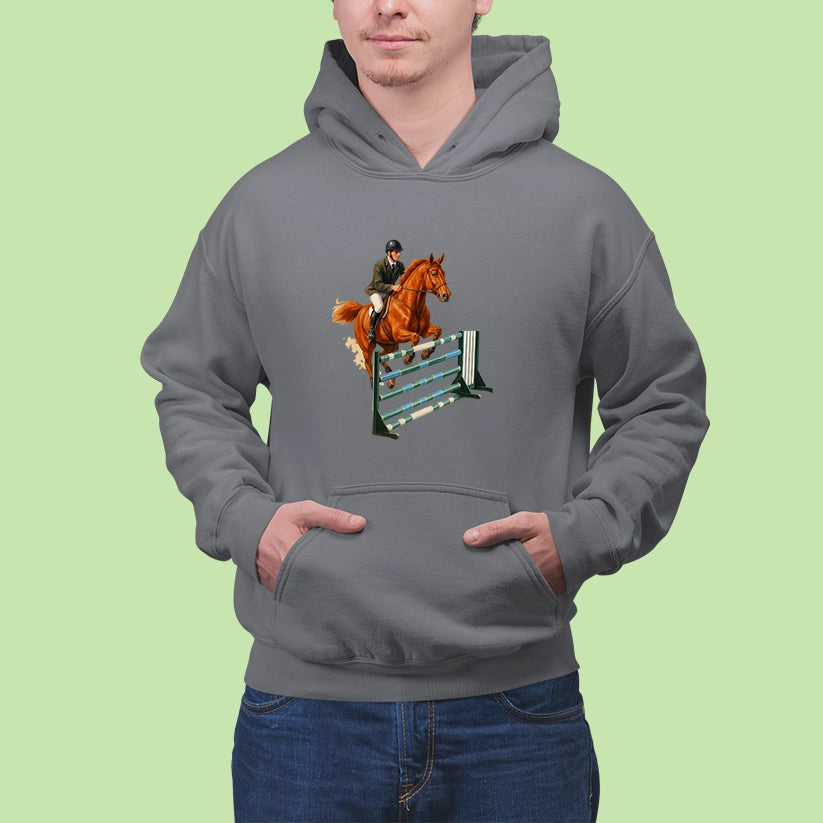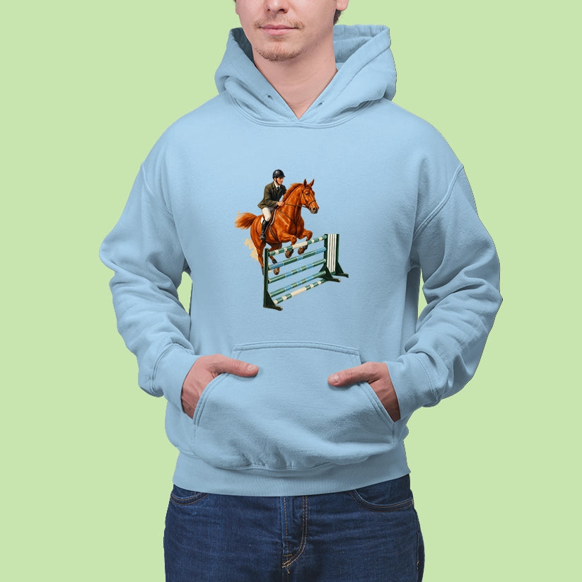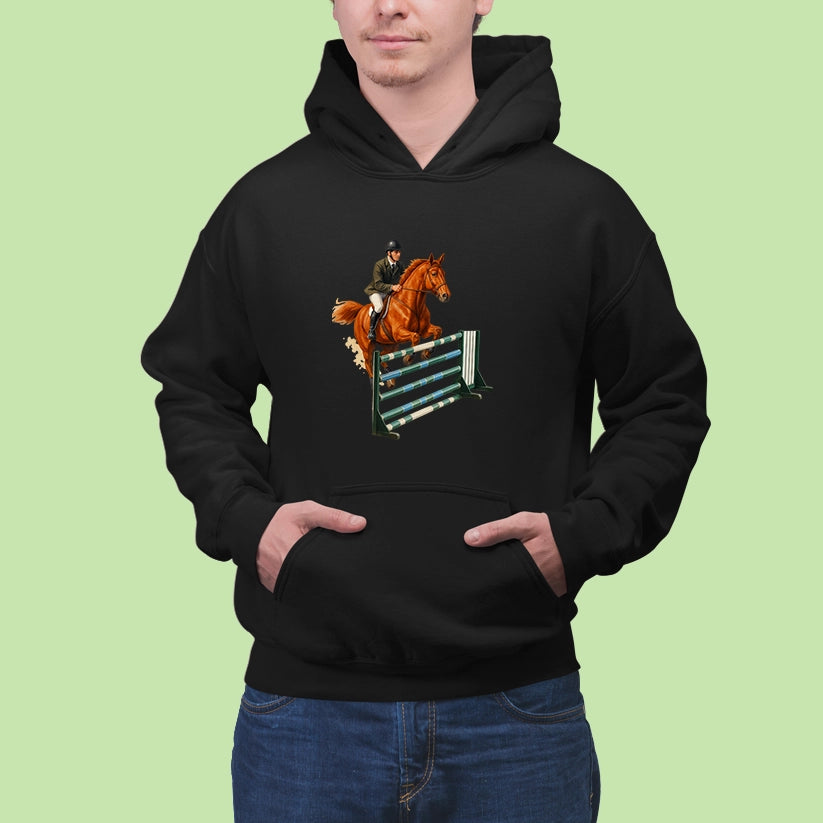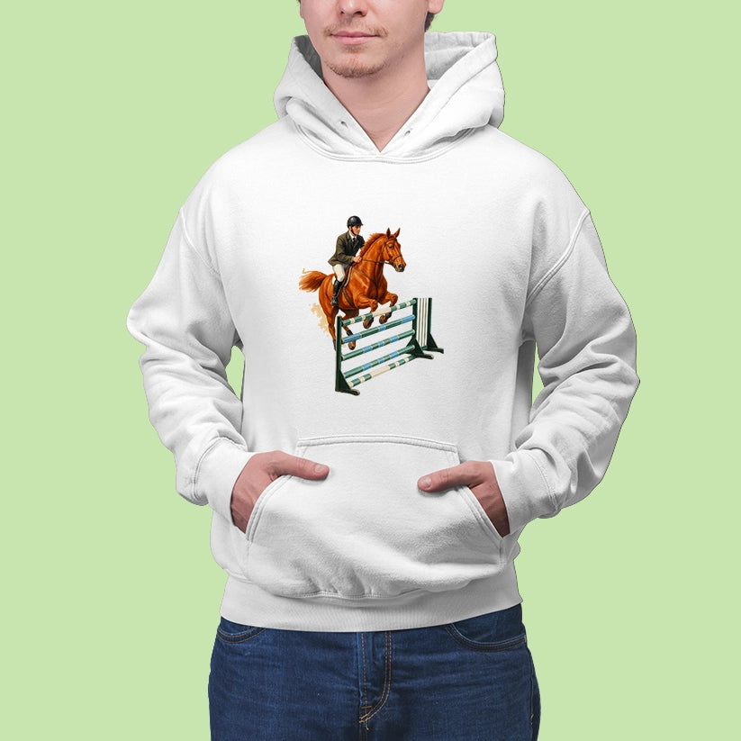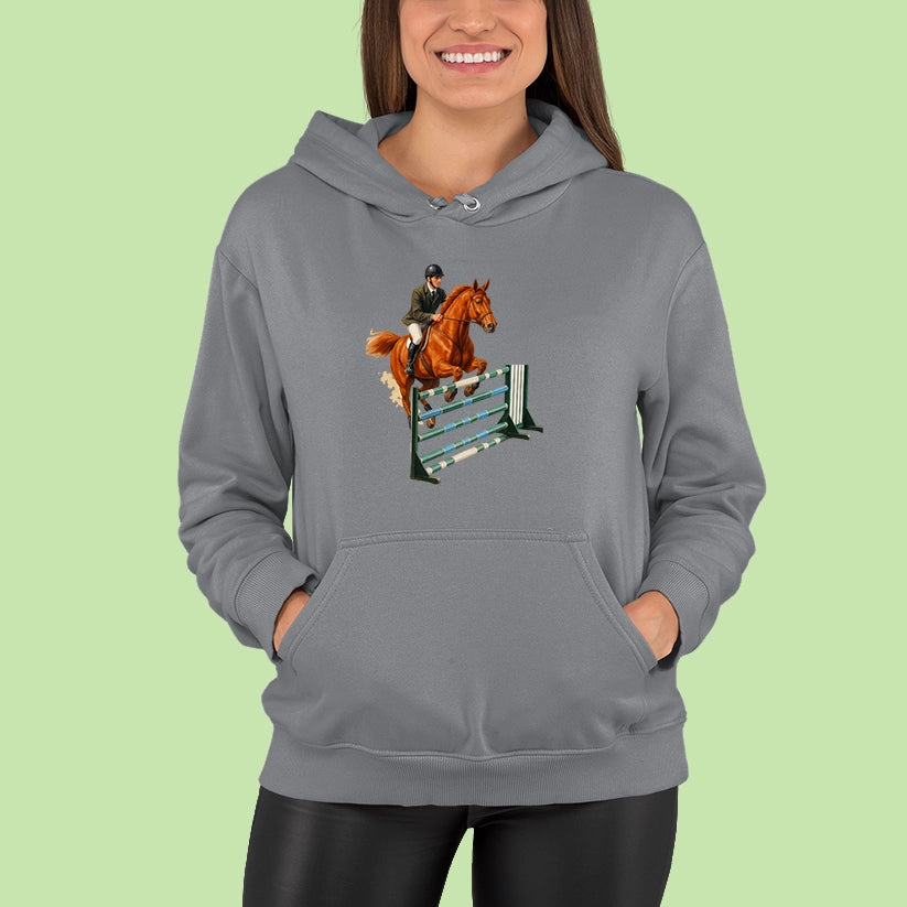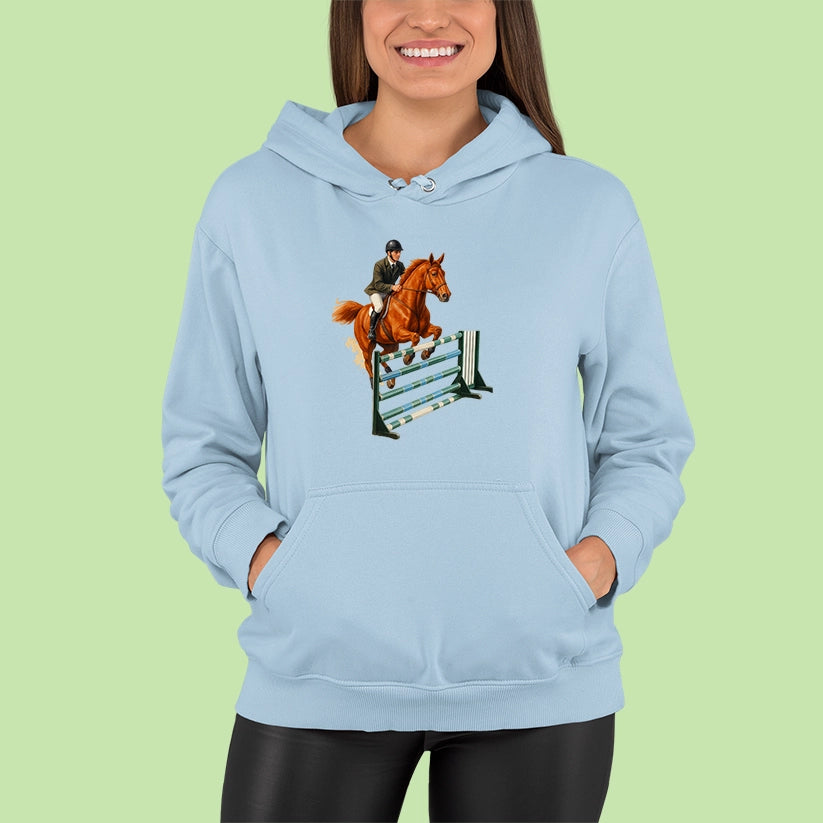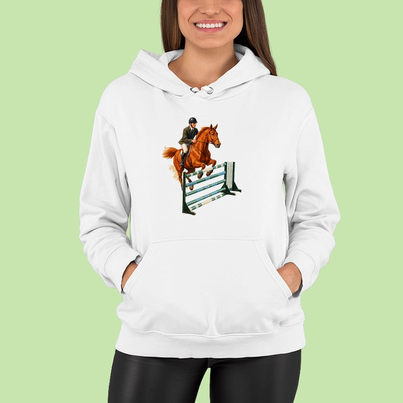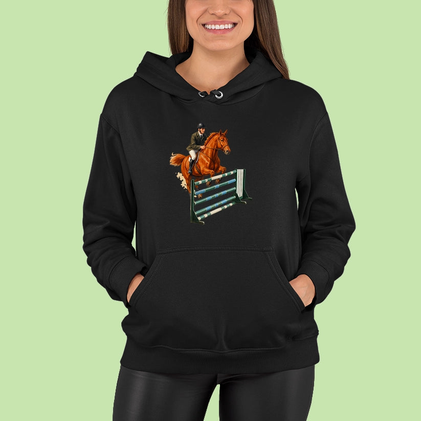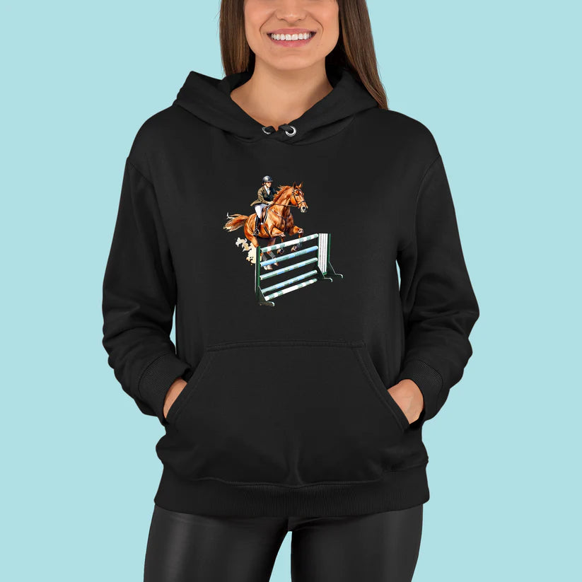 Pre každého, kto miluje ten pocit, keď spolu s koňom prekonáva limity! Táto mikina s elegantnou potlačou jazdkyne v akcii je ideálna pre fanúšikov parkúrového jazdenia, súťaží či len pre tých, čo milujú kone a slobodu pohybu.